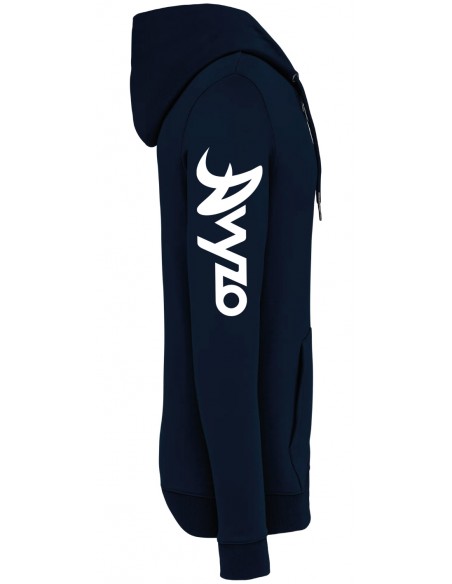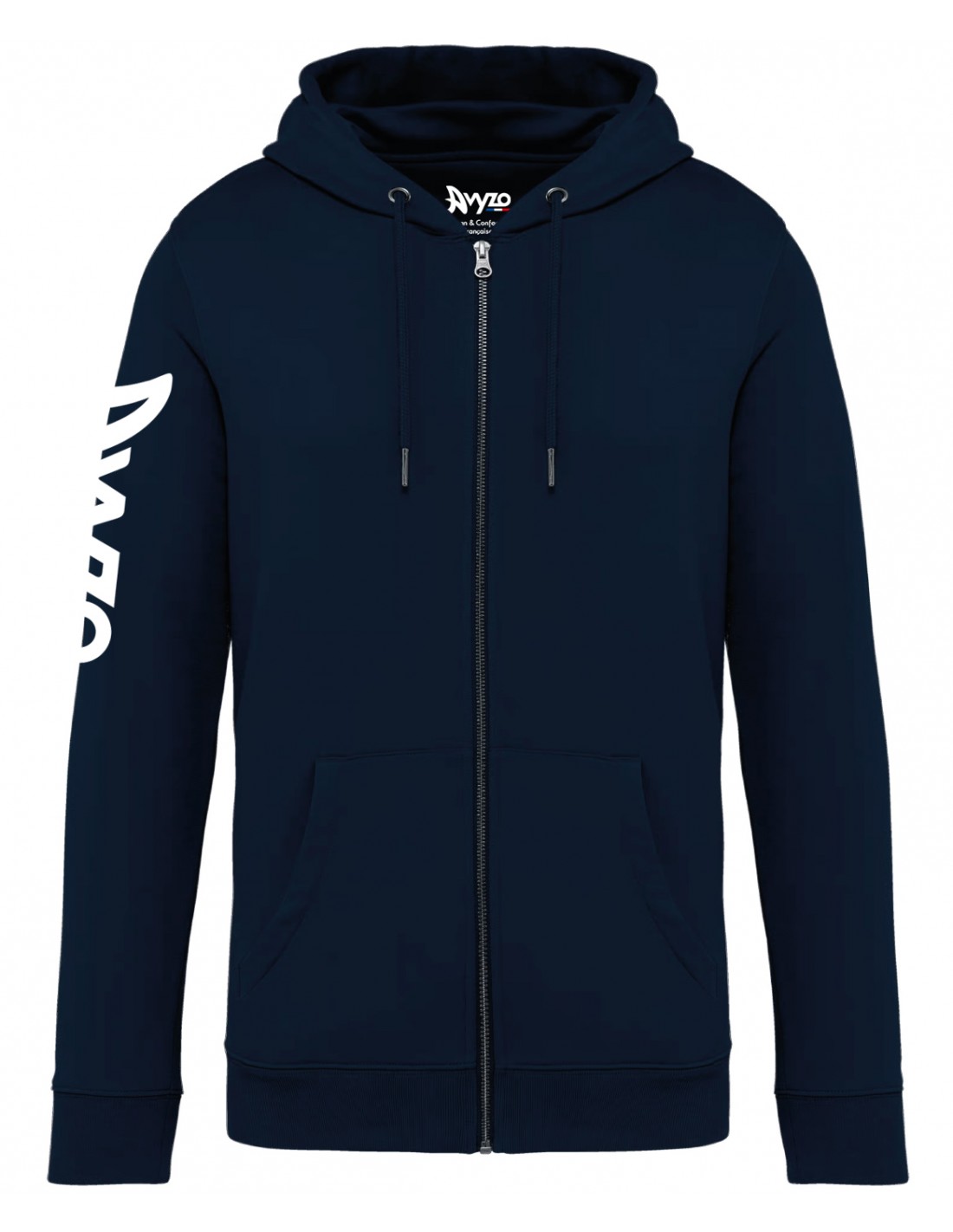 85% coton biologique / 15% polyester recyclé post-consumer. Coton peigné ringspun. Coupe ajustée. Lavé aux enzymes. Molleton gratté 3 fils LSF (Low Shrinkage Fleece : molleton pré-rétréci). Zip métal. 1/2 lune au dos. 2 poches kangourou. Bord cote 1 x 1 bas de vêtement et bas de manches. Double surpiqûre bas de manches, emmanchures, bas de vêtement. Capuche doublée en matière principale avec point d’arrêt cordon. Cordon rond avec embouts et oeillets en métal recyclé. Bande de propreté intérieure en chevrons.